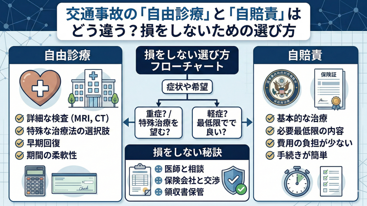 本記事では、2026年現在の最新実務に基づき、自由診療と自賠責保険の違い、そして交通事故において「なぜ自由診療が選ばれるのか」という理由を、専門用語を使わずに分かりやすく解説します。